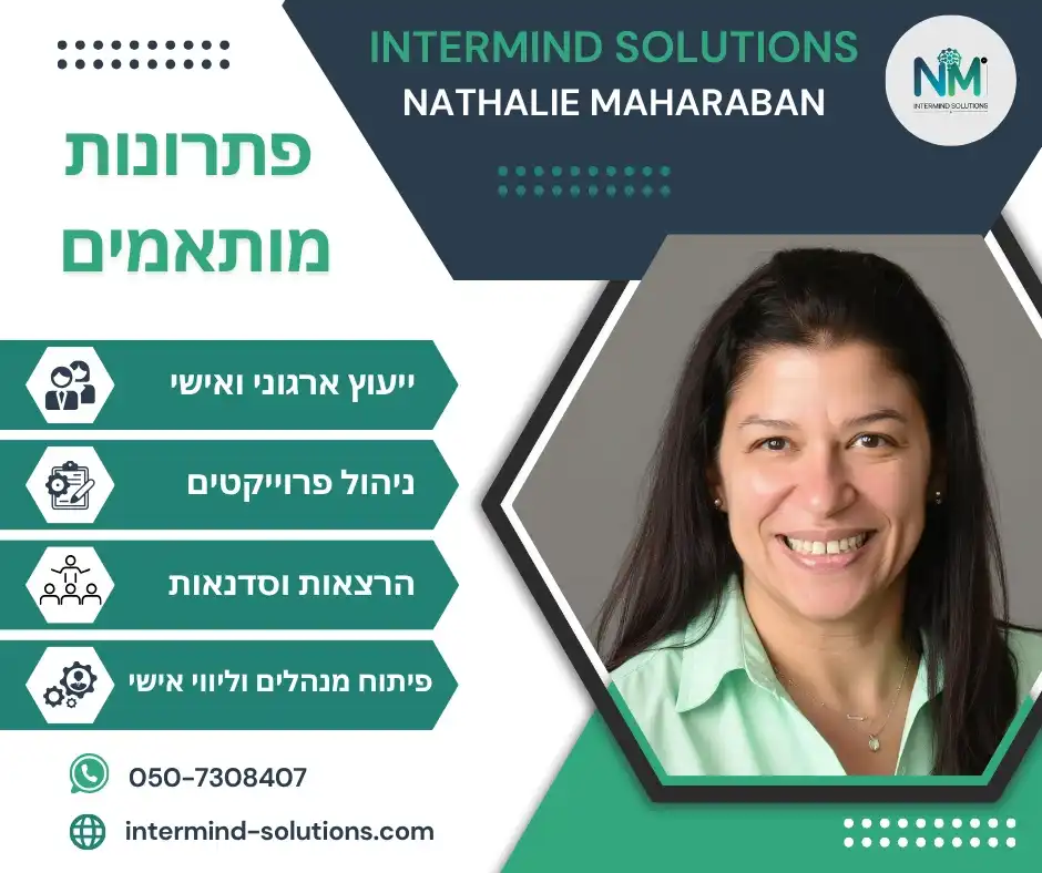 שמי נטלי מהרבן, ואני מייסדת NM | InterMind Solutions מתוך חזון לחבר בין עולמות הארגון, האדם והטכנולוגיה. לאחר שנים של ניסיון מקצועי והובלת תהליכים משמעותיים, החלטתי ליצור מרחב שבו ניתן להעניק מענה מדויק, רגיש ומעשי לארגונים ואנשים שמבקשים להתקדם. הגישה שלי מבוססת על שילוב בין פרקטיקה ניהולית, ראייה הוליסטית והבנה עמוקה של דינמיקות אנושיות. אני מאמינה שכל ארגון יכול לצמוח, וכל אדם יכול למצוא את הדרך הנכונה לו — אם רק נדע לשאול את השאלות הנכונות ולבנות את הדרך ביחד.